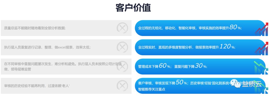 客户反馈E-AUDIT系统对审核的质量、管理有了很多的提升和保障,对审核员的要求严格,相比之前线下的情况,让审核员更加认真专注在审核任务,提升了管理层审核问题管理、审核员审核完成率及审核完成质量水平,对我司的响应速度也是高度认可和肯定,点名赞许了测试、开发同事的耐心和认真。